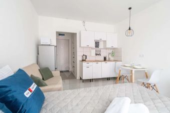 Уютные однокомнатные апартаменты в Современном ЖК. Квартира-студия с собственной ванной комнатой, кухней и спальней. В качестве гостиной зоны небольшой диван с журнальным столиком и обеденной зоны. В коридоре есть большой шкаф. Квартира удобна для проживания командировочных или семьи с ребенком, потому что диван раскладывается. В студии есть вся необходимая посуда, мебель и бытовая техника для комфортного проживания 3-х человек. До метро Некрасовка 10 минут пешком.