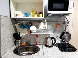 В кухонной зоне полный набор посуды, холодильник, микроволновка, чайник и плита всё, чтобы вы могли приготовить себе что-то вкусное или просто насладиться чаем после долгого дня. Чай, кофе, сахар уже есть в кухне