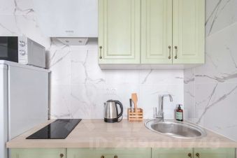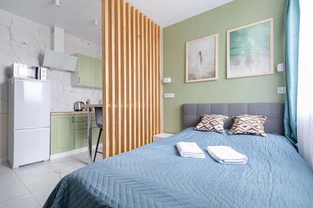 В студии есть всё необходимое для проживания. Двуспальная кровать, телевизор, обеденная зона и кухня с необходимой бытовой техникой. Также есть вся посуда для приготовления еды. В ванной комнате есть собственная стиральная машина, по этому студию можно снять не только на сутки, но на более длительный срок.