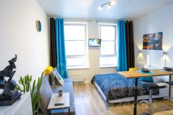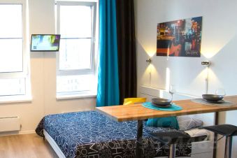 В in city apart объединены несколько функциональных зон в одной комнате. У нас есть отдельная зона для отдыха, где расположен удобный диван и телевизор, а также придвижной журнальный столик. Также есть обеденная зона с барным столом и стульями, где можно комфортно пообедать. Кухня в студии оборудована всем необходимым. Спальная зона имеет удобную кровать с ортопедическим матрасом materlux. На окнах шторы блекаут.