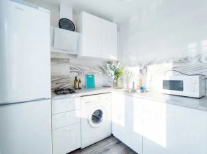 Кухня со всей необходимой посудой и техникой: холодильник, микроволновка, чайник, духовка, электрическая плита