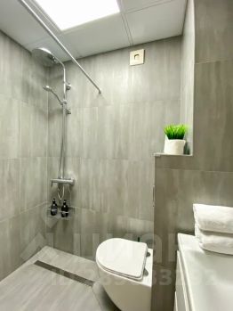 Светлая ванная комната с душем подарит вам приятную расслабленную атмосферу.
