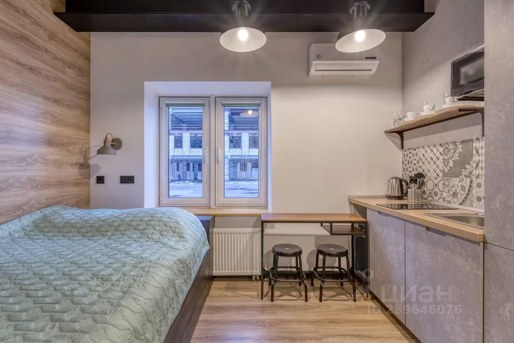 В студии есть вся необходимое мебель и техника, необходимая для проживания: