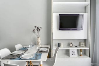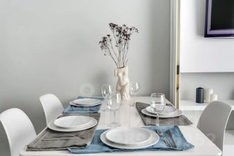 В квартире есть вся необходимая техника: кондиционер, холодильник, посудомоечная машина, варочная панель, вытяжка, свч-печь, стиральная машина, утюг и гладильная доска, сушилка для белья.