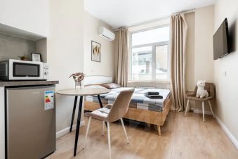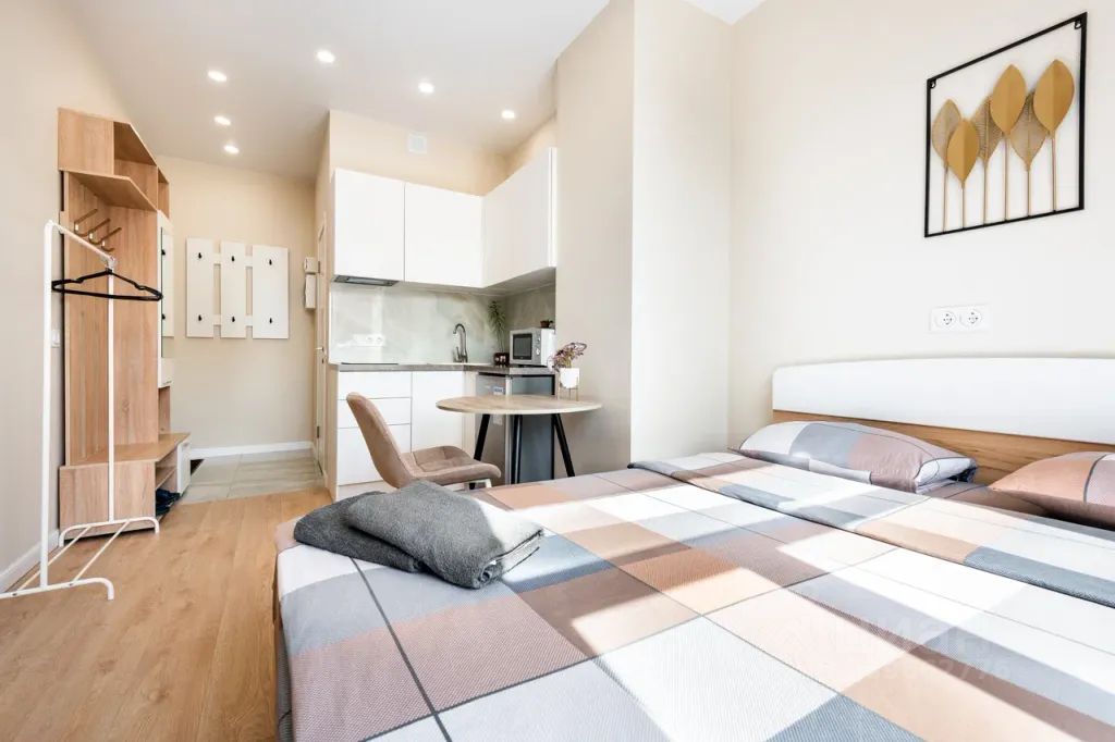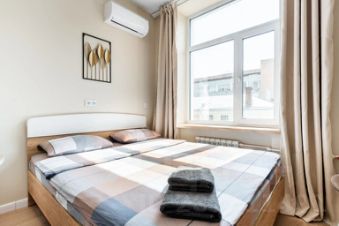 Стильная квартира с современным дизайном оборудована двуспальной кроватью с ортопедическим матрасом, блэкаут шторами, чистым постельным бельём, в студии установлен водонагреватель, тапочками, местом для хранения одежды, посудой на 2 персоны, wi-fi и телевидением с заботой о вашем комфорте.