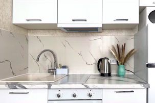 - плита, микроволновка, духовка, вытяжка, чайник, холодильник;