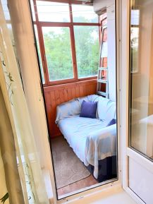 В комнате шкаф, 2-х спальная кровать, 2 тумбочки, большая тумба - комод,, стол., телевизор, полки. Большой ЗАСТЕКЛЕННЫЙ БАЛКОН с диваном и видом на зелёную зону.