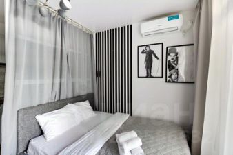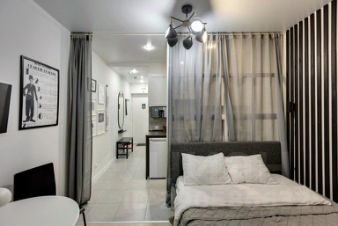 Квартира для 2 человек. Спальная зона с двуспальной кроватью отделена перегородкой от кухни. Гостям предоставляются: постельное бельё, комплект полотенец, тапочки, фен, мыло, шампунь, гель для душа, зубная щётка и паста.