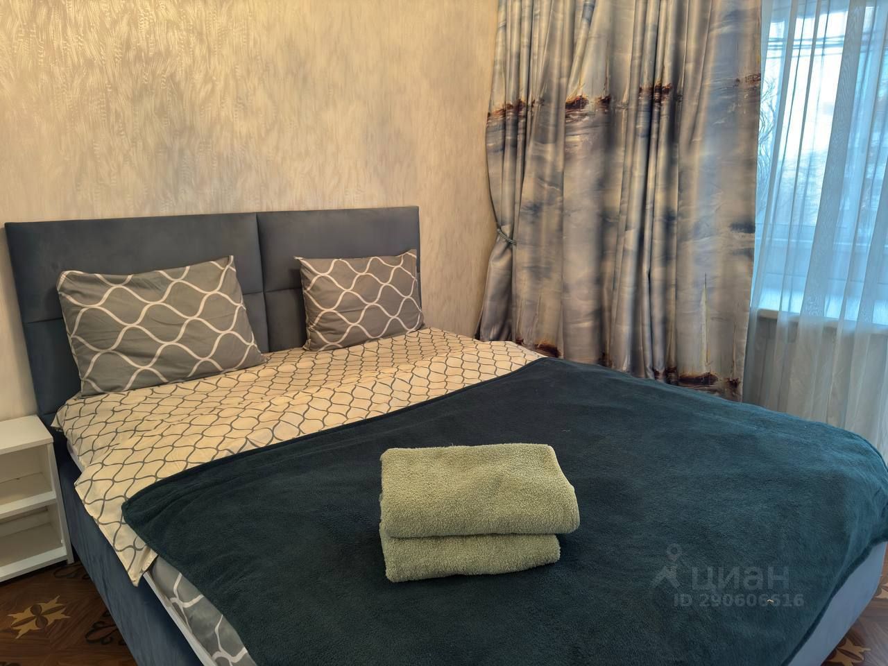 Большая двуспальные кровать с хлопковым постельным бельем очень приятным к телу.