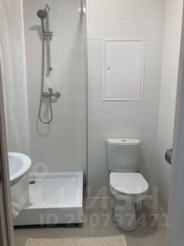 В студии совмещенный санузел с душевой кабиной, раковиной со шкафчиком с зеркальной подсветкой.