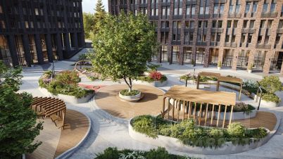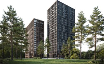 Подземный паркинг, двор без машин, выход в благоустроенную рощу.