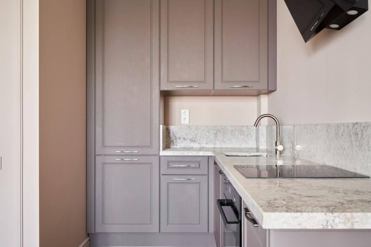 Кухня-гостиная. Встроенная техника: плита, духовка, вытяжка, холодильник. В зоне гостиной диван (не расправляется) и обеденный стол на четверых человек.