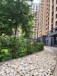 Закрытая территория. Двор без машин с камнями, краснолистными кленами, детской площадкой и прочими приметами современного благоустройства. За домом - набережная с видом на Сити.
