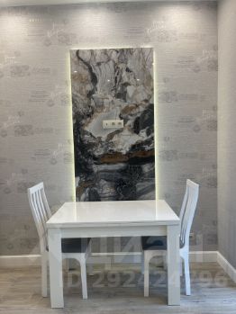 На кухне в обеденной зоне мраморное панно с подсветкой.