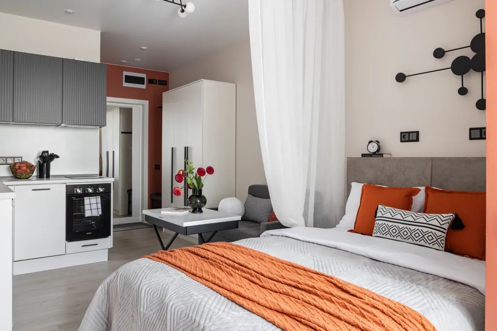 В зоне отдыха и сна размещена двуспальная кровать (140х200) с ортопедическим матрасом и белоснежным постельным бельём, односпальный диван (120х190), ТВ 50" со Smart-TV, кондиционер. Для комфортного сна предусмотрена римская штора блэкаут.