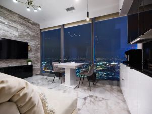 Гостиная оборудована современной зоной отдыха с телевизором и беспроводным доступом в Интернет. Кухня полностью оборудована всей необходимой бытовой техникой, посудой и столовыми приборами. Здесь вы можете приготовить вкусный завтрак или обед, наслаждаясь панорамным видом на город.