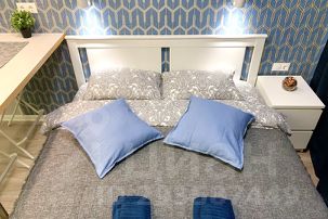 Двуспальная кровать с удобным матрасом. Застеленное чистое постельное белье для комфортного сна.