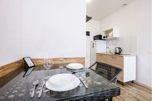 - Апартаменты укомплектованы электрической плитой, чайником, телевизором, холодильником и микроволновкой.