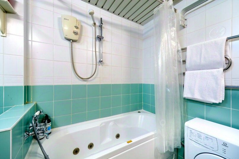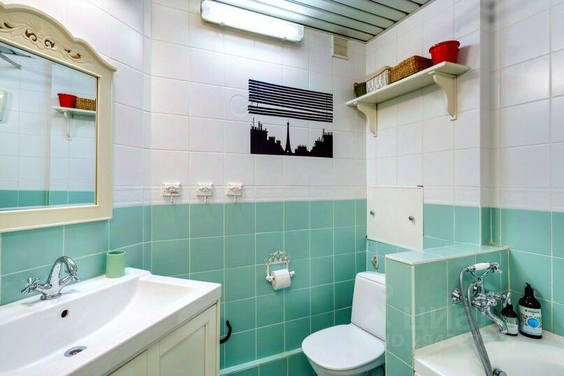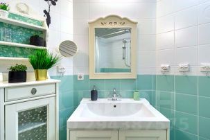 Ванная комната выполнена в голубых тонах, имеет полноценную ванну, которую вы можете принять после тяжелого дня, а также стиральную машину и множество предметов декора.