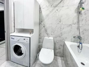 В квартире есть вся необходимая мебель и техника: кондиционер, кухонный гарнитур с варочной панелью, духовым шкафом, вытяжкой, посудомоечной машиной, микроволновой печью, холодильником. В спальне двуспальная кровать и вместительный платяной шкаф. Гостиная зона с диваном и телевизором. Ванная комната с ванной совмещена с туалетом, укомплектована стиральной машиной, есть полотенцесушитель и качественный водонагреватель. Тёплые полы во всех помещениях. Окна во двор.