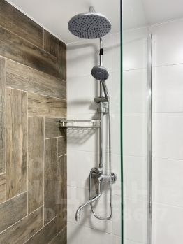 Ванная комната с душевой кабинойи средствами личной гигиены.