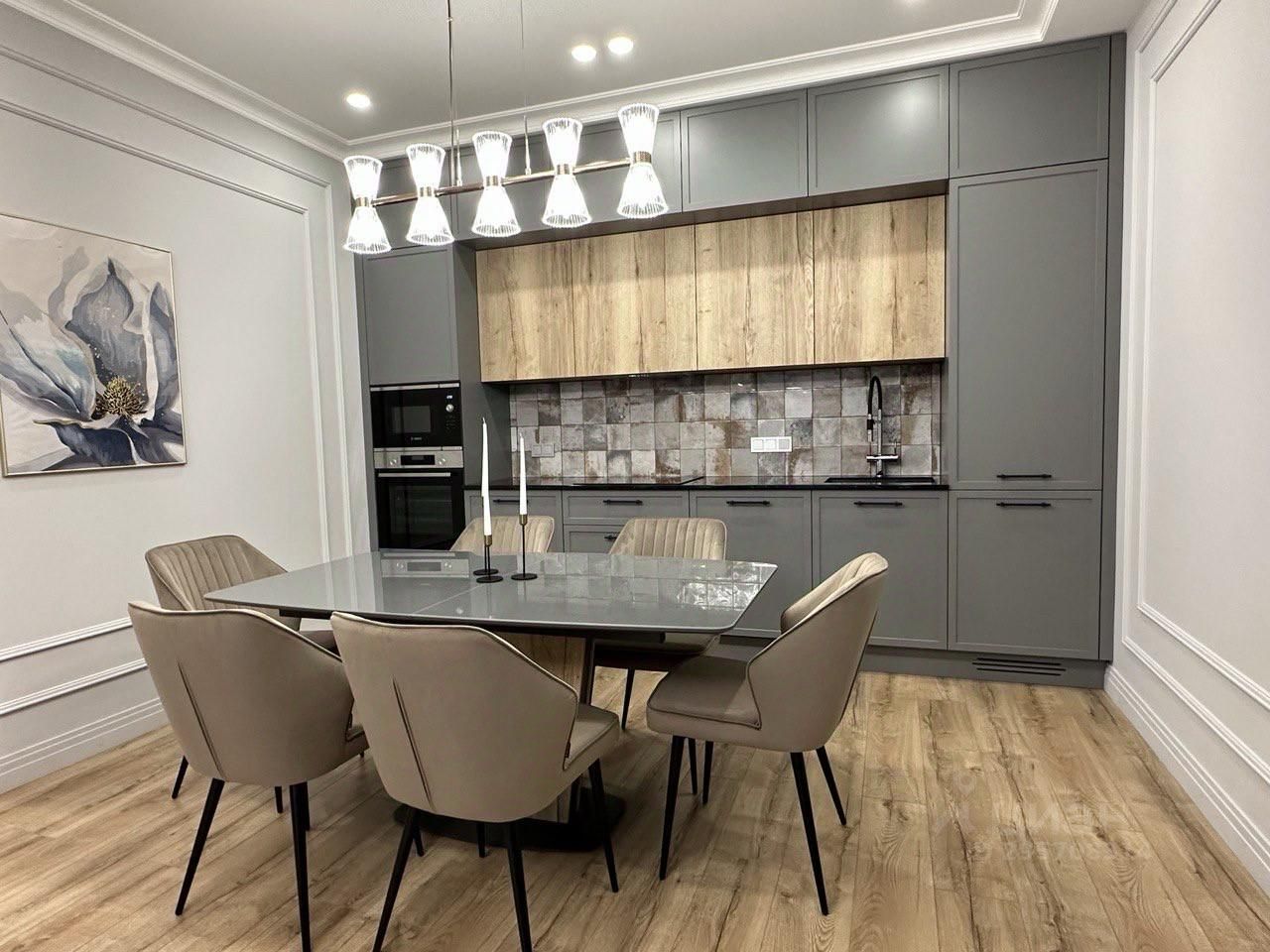 Кухня от Dantone Home оборудована встроенной кухонной техникой Bosch (варочная плита, духовой шкаф, посудомоечная машина, микроволновка, холодильник), вытяжка. На кухне установлена система фильтрации воды с обратным осмосом и минерализацией.