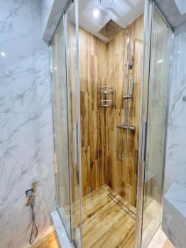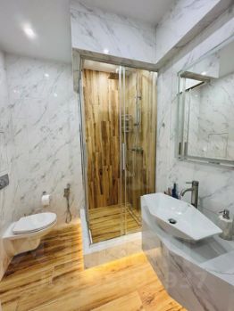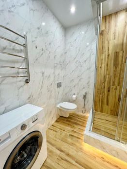 Квартира оснащена большой системой хранения -гардероб, стиральной машиной, душевая кабиной, душем-биде. Кухня с функциональной мебелью, встроенным холодильником, варочная панель, духовой шкаф, микроволновая печь, фильтр тонкой очистки воды, полный комплект новой дизайнерской посуды, электрочайник.