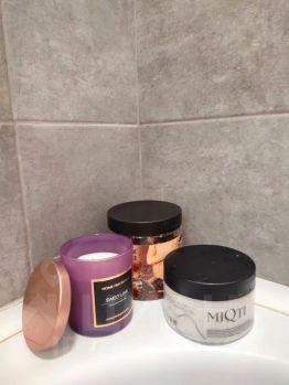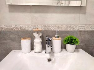 Ванная комната с большой ванной. Фен, мягкие полотенца и средства гигиены: одноразовые тапочки, шампунь, мыло.