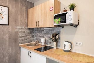 - Апартаменты укомплектованы электрической плитой, стиральной машиной, чайником, телевизором, холодильником, феном, утюгом и микроволновкой.