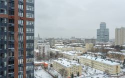 Вид из окон не в упор с соседним корпусом, а на пространство между тремя корпусами. Высота потолков почти 3 метра.