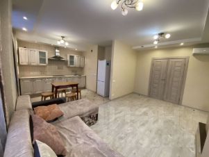 ламинат+плитка, фактурные обои, многоуровневые потолки с точечным освещением + люстры, стеклопакеты (окна во двор). Квартира меблирована и оборудована бытовой техникой: плита, стиральная машина, холодильник, микроволновка, ЖК ТВ и кондиционер. В подъезде дома видеонаблюдение, консьерж.