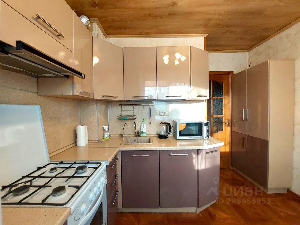Кухня со всей необходимой посудой и техникой: холодильник, микроволновка, чайник, духовка, электрическая плита