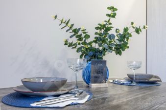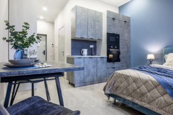- Полностью оборудованная кухня: холодильник, варочная панель, вытяжка, чайник, набор посуды и столовых приборов, а также чай, кофе и сладости.
