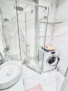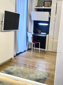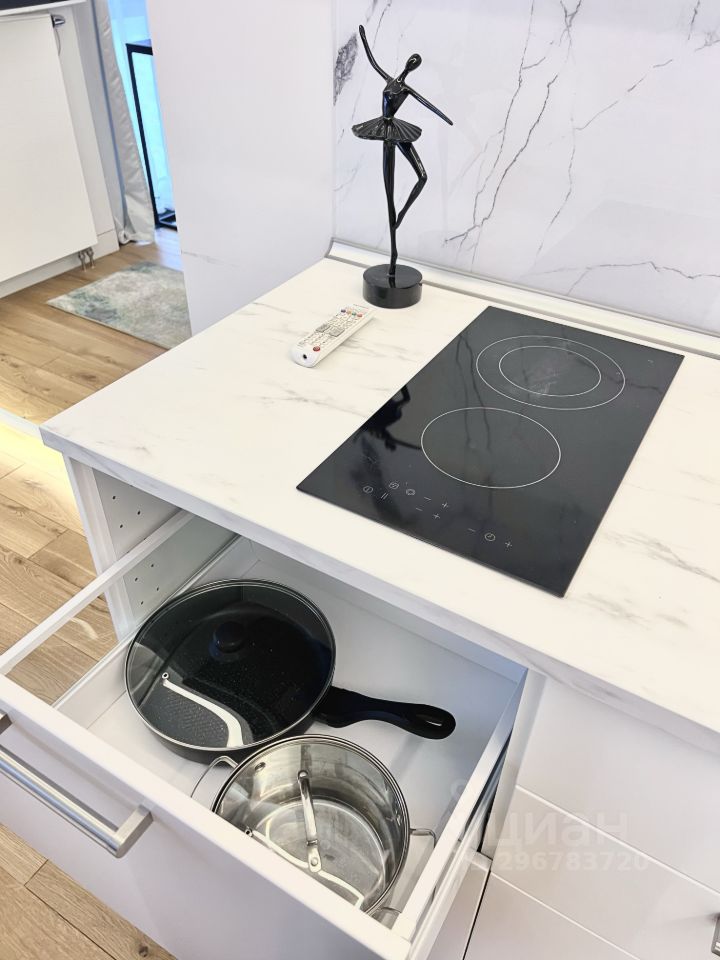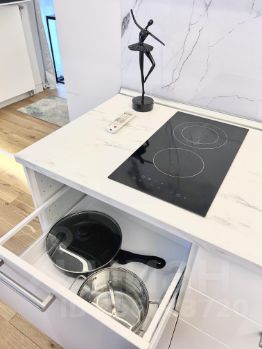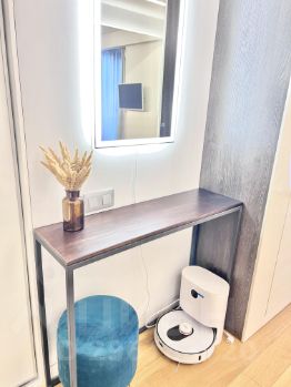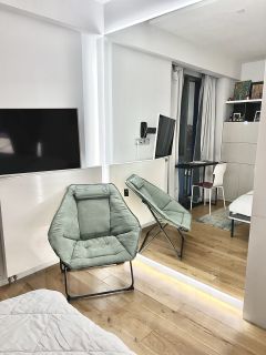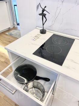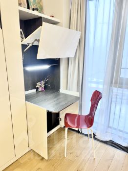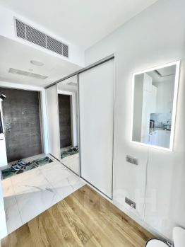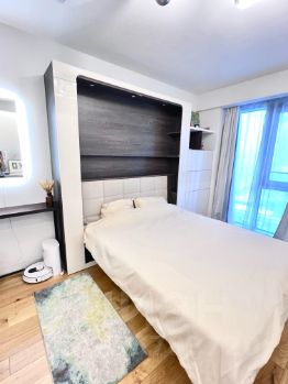 В квартире есть вся необходимая для комфортного проживания техника: холодильник, посудомоечная машина, варочная панель, вытяжка, микроволновая печь, стиральная машина, пылесос. Из мебели премиальная раскладная двуспальная кровать-трансформер с ортопедическим матрасом (160/200), выдвижным столом и стеллажами, что позволяет максимизировать свободное пространство в сложенном состоянии. Зеркало с подсветкой на всю стену также дает эффект дополнительного пространства и комфорта. В прихожей вместительный шкаф для одежды.