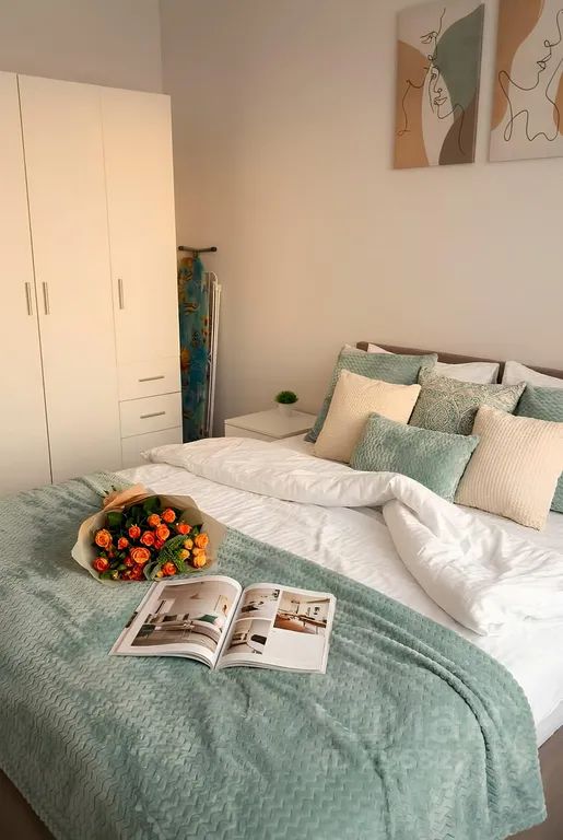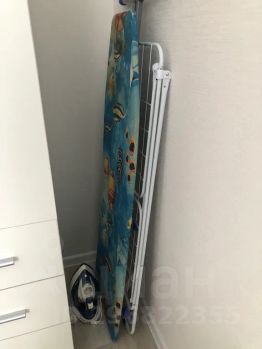 Широкая двухспальная кровать с ортопедическим матрасом. А также блокирующие свет шторы, которые помогут хорошо выспаться и восстановить силы, шкаф для одежды, прикованные тумбы и светильник, гладильная доска + утюг, сушилка.