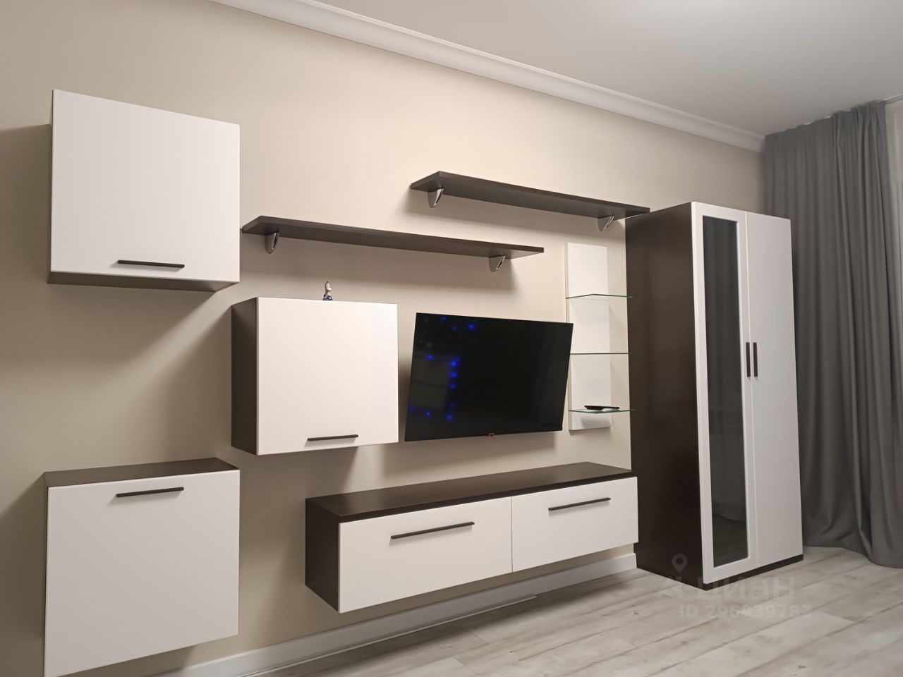 в гостиной: ТВ, настенный гарнитур со шкафом и большой диван;