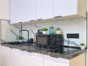 оборудованную кухню (посуда, плита, микроволновая печь, чайник, холодильник, губка и гель для мытья посуды),