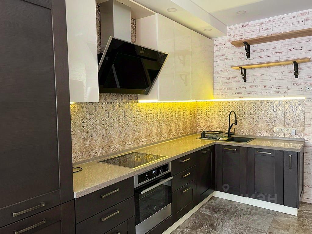 Кухня - гостинная : (кухонный гарнитур, варочная панель, СВЧ, духовой шкаф, посудомоечная машина, холодильник, обеденный стол, стулья, диван.