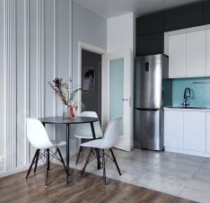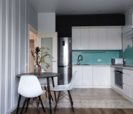 Светлая кухня-гостиная со всей необходимой техникой и мебелью.