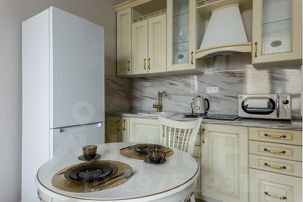 - На кухне: холодильник, варочная панель, вытяжка, чайник. Набор посуды и столовых принадлежностей. Чай, кофе и сладости.