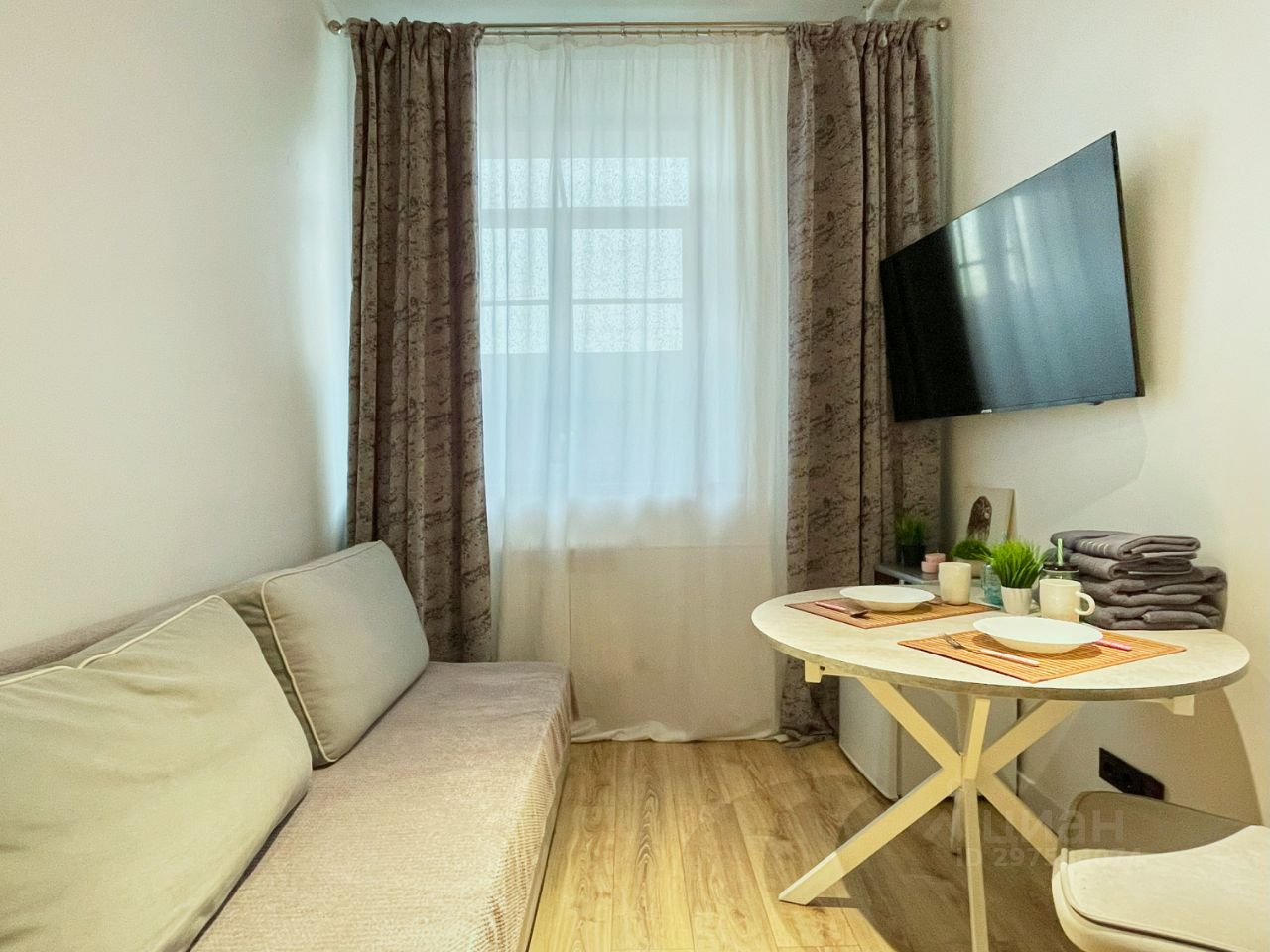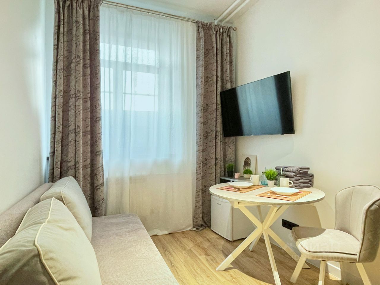 оборудованную кухню (посуда, плита, микроволновая печь, чайник, холодильник, губка и гель для мытья посуды),