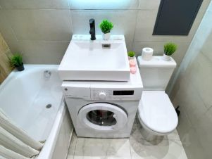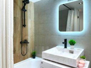 чистый санузел (душ+ванна, туалет, зеркало на стене, бойлер для нагрева воды на случай отключения горячего водоснабжения),