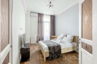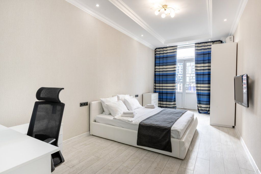 Комнаты: 3. Две изолированные спальни с выходами на балконы по обе стороны дома, изолированная гостиная, кухня и столовая, раздельный санузел с ванной. Спальные места: 2+2+2+2. По одной двуспальной кровати в каждой спальне, дополнительный двуспальный диван в первой спальне, двуспальный раскладной диван в гостиной. Максимальное количество гостей: 6. Площадь: 80 кв.м. Этаж: 9 этаж 10-этажного дома, есть лифт. Парковка находится во дворе под шлагбаумом, включена в стоимость. В апартаментах есть высокоскоростной WiFi, кабельное ТВ, кондиционеры, утюг, гладильная доска и сушилка для белья, одноразовые тапочки. В спальнях ортопедические матрасы, качественное бельё из сатина, шкафы и комод, телевизоры, письменные столы. А также балконы с местом для отдыха/курения. В гостиной большой раскладной диван, журнальный столик, шкаф, письменный стол. На кухне полный комплект посуды для сервировки и приготовления пищи; чай, кофе, сахар; бытовая техника: холодильник, плита, духовка, посудомойка, микроволновка, чайник. В ванной комнате ванна и душевая панель с гидромассажем, фен, стиральная машина, махровые полотенца по 2 штуки (большое и малое) для каждого человека, махровые халаты (индивидуально), шампунь, мыло, гель для душа, ватные диски и палочки, туалетные принадлежности, швейный набор. Во дворе есть парковая зона, детская и спортивная площадки.