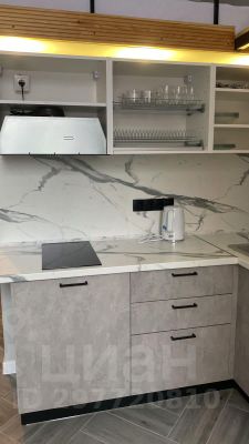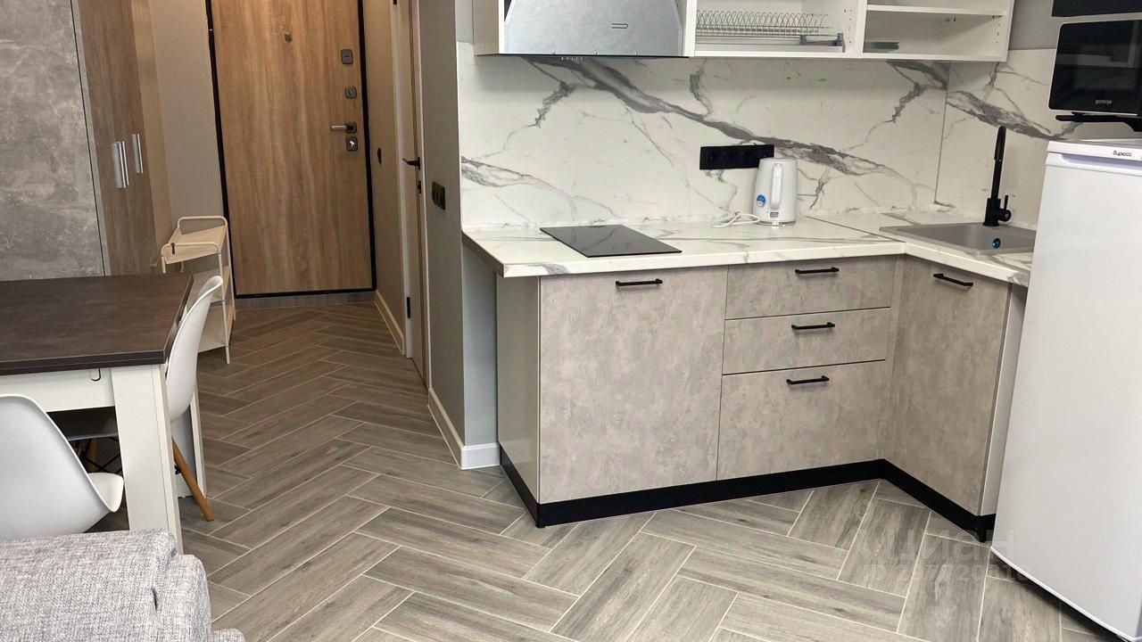 - полноценная кухня: встроенный гарнитур, варочная панель, микроволновка, электрочайник, вытяжка, обеденный стол (раскладной), два стула, холодильник, полный комплект посуды и приборов (тарелки, кружки, кастрюля, сковорода, вилки, ложки столовые и чайные, половник, лопатка, шумовка, набор ножей;