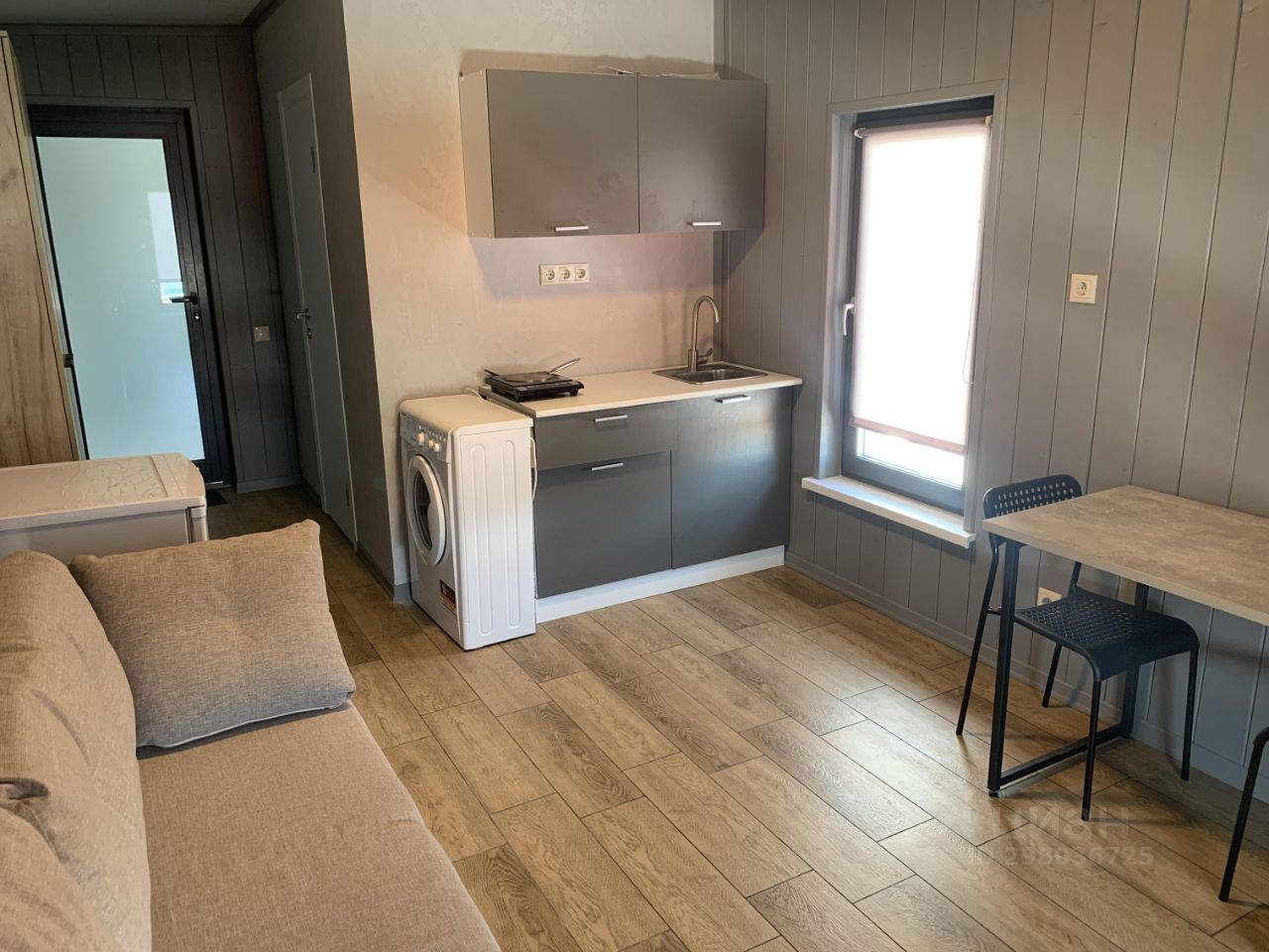 Студия находится в частном доме. Свой санузел. Есть все необходимое для проживания: стиральная машина, холодильник, плита, стол.