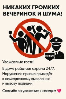 ПРИ НАРУШЕНИИ ПРАВИЛ ПРОЖИВАНИЯ И ТИШИНЫ БУДЕТ СРАЗУ ВЫЗВАНА ПОЛИЦИЯ С ВЫСЕЛЕНИЕМ ВСЕХ ГОСТЕЙ!!!