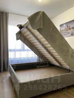 Спальня: кровать двуспальная с подъемным механизмом, шкаф для одежды вместительный, тумбочка и консоль для хранения.