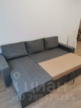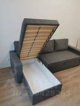 Кухня-гостиная: гарнитур, посудомоечная машина, холодильник Atlant, электрическая индукционная плита и вытяжка, микроволновка, чайник, стол, 2 стула и 2 табуретки, диван раскладной мягкий с подушками и с подъемным механизмом для хранения вещей, консоль с телевизором, кондиционер.
