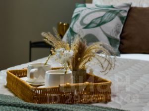 В апартаментах вас ждёт широкая двуспальная кровать , премиальное постельное белье, мягкие подушки и воздушное одеяло — создающие атмосферу домашнего уюта. Полностью оборудованная кухня включает все необходимое: холодильник, варочную панель, духовой шкаф, посудомоечную машину, вытяжку, набор посуды и столовых принадлежностей — чтобы вы могли готовить и наслаждаться едой без лишних хлопот.