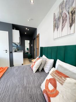 Апартаменты встретят Вас полностью оборудованной и укомплектованной всем необходимым: плита, холодильник, телевизор, микроволновая печь, электрочайник, фен, утюг, посуда, качественное постельное белье, бесплатный WI-FI!